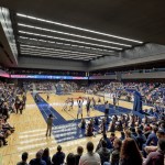 The vision for the voyeuristic facility stemmed from the fact that a full program of regulation basketball and volleyball courts, lobbies, training, and sports medicine facilities had to be stacked vertically to fit the compact urban site. First up, the courts: Moving the column-free Field House below grade meant that the north and south ends of the building had to support a 180-foot span using 23-foot-tall steel trusses. The two perimeter trusses, brought down to street level to connect to the cantilevered ground-floor slab, offer additional lateral support. The large steel trusses double as the cable-support for a high tensile glass wall, which adds stiffness to the entire structure.