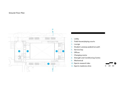 “The primary functional spaces in the building feature large, clear areas of glazing to visually connect to the campus,” Patkau says, while more private areas such as faculty offices, research labs, and medical clinic have windows that are veiled by a perforated corrugated aluminum cladding that doubles as sunshading. “Language and design had to be reduced to their essentials because of a tight budget,” Watson says, but that wasn’t a hindrance. Rather, it was “something that let us play with different expectations of the sports facility.”