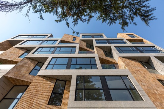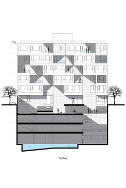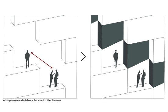Creating double height terraces that do not overlook is a challenge that transformed the facade into stepped terraces, and was also a response to the aspect ratio of the building. The shadings and the filled and empty spaces and stretching the facade material into the interior spaces have improved the quality of living space.