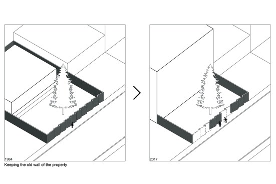 With the construction of new buildings in an alley and the destruction of old buildings, the image of the inhabitants of their neighborhood is ruined and gradually disappears, and after all, all forms are completely changed. In order to respect the visual memory of the people from the walls of the alley, we decided to preserve the walls of the old property and, for the openings, we considered glass walls, so that the inhabitants can experience continuous sight through the walls.