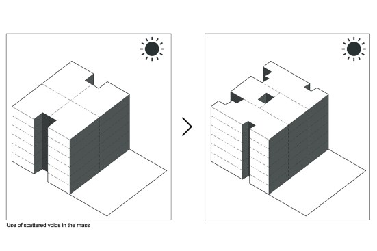 Here, by scattering and increasing the number of voids at the project, lighting is provided for three units directly and for one of them, three separate voids on three different sides are considered. The lobby of the elevators and the middle sections of the larger units also benefit from natural light.