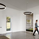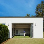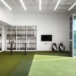 The front mass of the facility houses the entry, two practice driving studios, and equipment fitting studio, whereas the back mass contains a multipurpose event area, practice putting studio, office, and restrooms. The three front studios open to the entire driving range, where a golfer can swing out of the building through an 11-foot tall, six-panel, folding door. With the retractable screen down, a golfer can experience the virtual motion-capture swing platform. The practice putting studio contains an innovative feature: a topographical moving floor that can be programmed and shaped to numerous inclines and undulations.