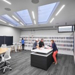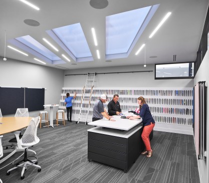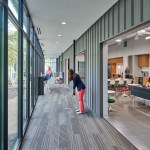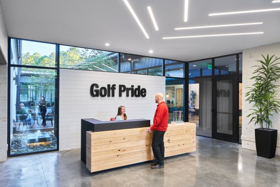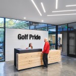 Golf Pride is the global leader in golf grip technology and boasts a newly redefined corporate headquarters that enhances collaboration and innovation while giving cues to the rich history of Pinehurst, North Carolina. Strategically located on Pinehurst No. 8, the exterior design of the 35,996-square-foot building – containing retail, office space and an R&D department – reflects traditional Pinehurst architecture through its thoughtful composition of brick and wood materials complemented by ample native landscaping. The interior welcomes staff and clients with design elements of their grips subtly woven into the fabric of the building from golf grip mimicked lighting and carpet, to floor-to-ceiling wall graphics. Its open-office concept introduces unobstructed workstations, collaborative areas and focus rooms to foster creativity and encourage interaction. Additional amenities, such as a 9-hole indoor putting course and outdoor courtyard, provide an opportunity to test products showcased in the display room steps away from the R&D wing of the building.