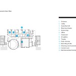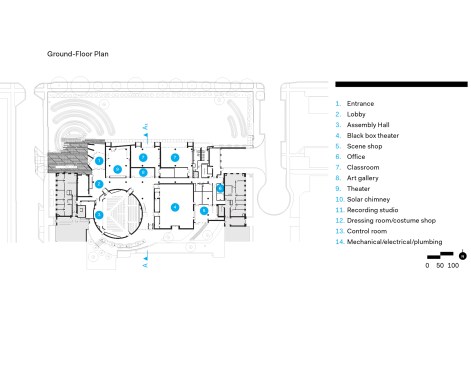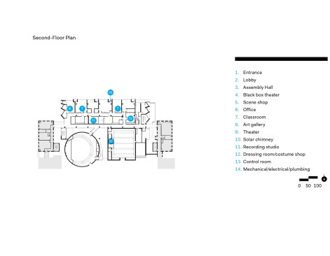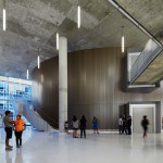 GPAH’s three-story plan is based on a double-loaded corridor, with the large spaces of the Assembly Hall—a 750-seat theater-in-the-round that sits just inside the entry—and the black box theater on the south side of the structure and learning spaces along the north. First- and second-floor teaching spaces are devoted to music, with the third floor set aside for arts and media. The theaters, which rise the full height of the building, are clad in a simple vertical metal panel system and face a courtyard and the Lab Schools’ 1962 International Style addition by Perkins+Will.