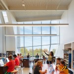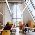 The building’s palette is quite simple, limited to five materials: an exposed concrete frame, a VS-1 glass curtainwall system, metal panels (used as a return on limestone faces), metal roof decking, and limestone (requested by the client) that matches the complex’s original Collegiate Gothic buildings. “We used limestone the least, but we wanted to get the most out of it,” Valerio says. And whether it’s the unusual pattern of three openings within the gabled entry façade or the vertical wall-mounted lighting throughout the corridors, seemingly random spacings are, in fact, based on the Fibonacci sequence: “We didn’t want a random pattern,” Valerio says. “It’s a hidden number sequence that kids could discover.”