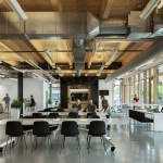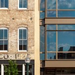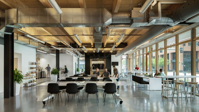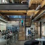 Connected within to form a single, airy workspace with abundant daylight and natural finishes, the old building and its modern counterpart create a surprisingly compatible duo as seen from the sidewalk. Clad in patinated white brick and interrupted by delicate arches above the windows and classic 19th-century star bolts, the former Seed Company is paired perfectly with Tryba’s structure, which references its neighbor’s datum lines and the rhythm of its mullioned windows while opening up to the city with a gleaming, fully glazed façade. Atop the new volume, a small penthouse and wraparound terrace afford striking vistas of the downtown streetscape, bringing employees together and reconnecting them to the city.