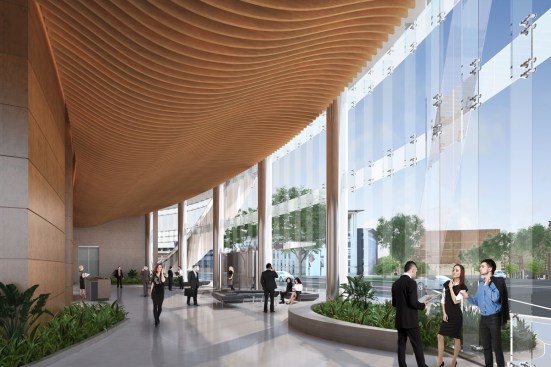 Integrated into the city fabric, the sweep of the tower base forms a plaza that links to a new pedestrian promenade leading to City Hall Plaza. To further enhance the public space, the office tower’s transparent lobby will feature a dramatic presentation wall designed as a work of art that can be seen from outside. Signature street-front retail will also bring activity to the street.