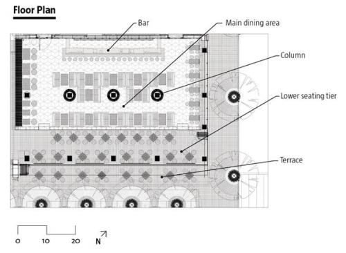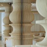 “The columns act as a natural continuation of the ceiling, geometrically inspired by traditional, lathe-spun, wooden table legs,” Todorov says. The covers are attached to supports made of MDF, which was scored and bent to form round columns. The repetition of identical elements recurs in tessellated floor and wall panels, the geometries of which were inspired by the work of M.C. Escher.