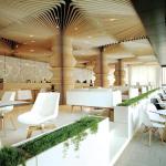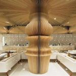 “The columns act as a natural continuation of the ceiling, geometrically inspired by traditional, lathe-spun, wooden table legs,” Todorov says. The covers are attached to supports made of MDF, which was scored and bent to form round columns. The repetition of identical elements recurs in tessellated floor and wall panels, the geometries of which were inspired by the work of M.C. Escher.