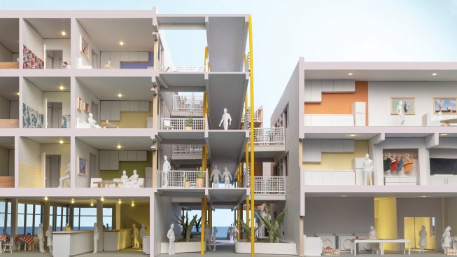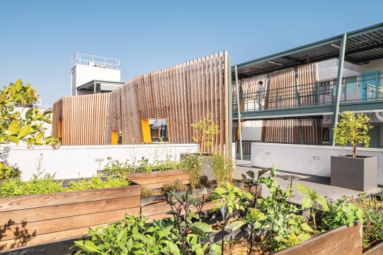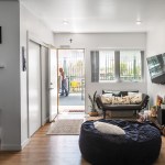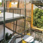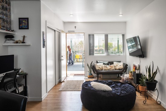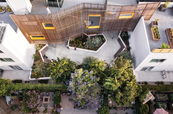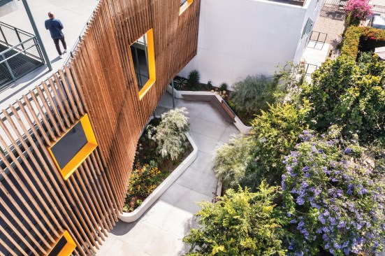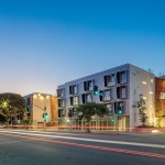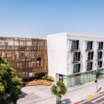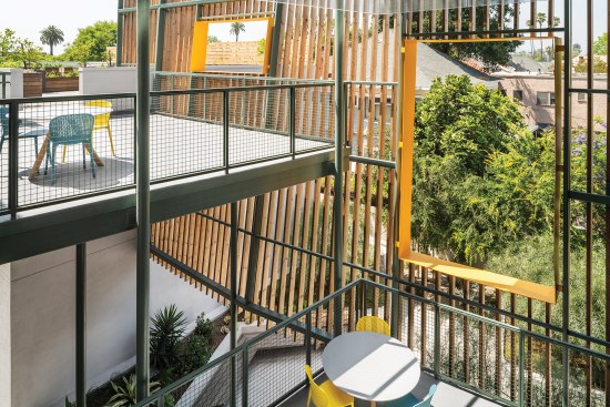 With six separate housing structures occupying a total of 70,000 square feet, circulation bridges tie together each property, with smaller, adjoining walkways between units creating front porches that foster conversations among neighbors. Ample greenery, including a rooftop edible garden, ensures that the project location just a few blocks from the Santa Monica Expressway doesn’t diminish residents’ quality of life, with a small, ground-floor retail area rented to a maker’s space encouraging further ties to those outside the facility.