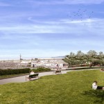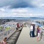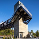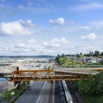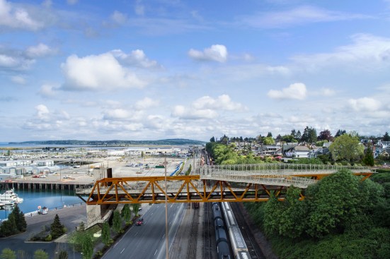 The firm’s long run of successful transportation-related projects (including a brand-new multimodal ferry terminal in Mukilteo, just north of Seattle) made LMN a natural choice for the 257-foot bridge. Everett, a coastal community, has long been disconnected from its coastline along Possession Sound. “It’s always been a manufacturing-based town,” says Van Dyck. Industrial and shipping facilities have dominated the waterfront, while a major north-south freeway and adjacent train tracks effectively severed the coastline from the bluff-top residential neighborhoods on the town’s west side. In recent years, however, new commercial and recreational development have crept down the hill; the area, says Van Dyck, has “blossomed,” necessitating new and improved ways to reach it.