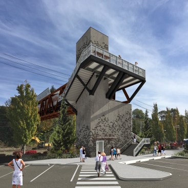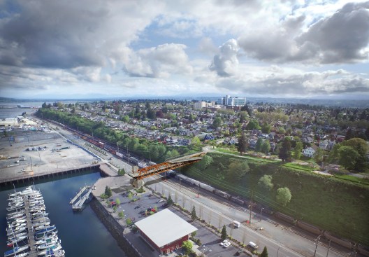 Elevating utilitarian infrastructure to a thoughtfully designed community asset, the Grand Avenue Park Pedestrian Bridge highlights the value of rethinking public realm design. The bridge will transform the Everett waterfront, establishing a new connection between the uplands Grand Avenue Park and the developing waterfront district. The project will fulfill a decades-long goal for a convenient, non-motorized passage to the waterfront, which has grown to feature a 66-acre mixed-use development, the Everett Farmer’s Market, and the largest public marina on the west coast. The challenge for this project was how to resolve essential engineering infrastructure and transportation functions as seamlessly as possible. By deconstructing the elements of the project—functional, aesthetic, and environmental—and reimagining the parts, the design team developed a solution that preserved the view while greatly minimizing the intervention into the steep, 75-foot-high hillside. The new design integrates accessible pathways into a sloped truss, eliminating the need for the uphill elevator and saving significant costs, all while elevating the pedestrian experience through a whimsical play of space, light, and structure. Integrating vertical circulation above, around, and within the truss, two ramps create a playful pathway, acting as switchbacks to reduce the grade change and frame a series of dramatic views to Whidbey Island, the waterfront, and the Olympic Mountains. The ramps bring pedestrians through a varied sequence of spaces that interact with the structure, beginning above, then cantilevered outboard over the highway, and finally bringing them within the truss itself. Along the pathway, a sequence of viewing platforms offers multiple experiences of the surrounding landscape. Recalling the hard-working vernacular of a railroad overpass, the weathered steel trusses of the bridge’s frame have been strategically positioned to echo the ramp volumes and sectioned over the active railway to allow for ease of installation during construction. Stormwater overflow piping—the initial impetus for the project—all but disappears beneath the pathway, reinforcing the bridge’s ability to elegantly solve simultaneous challenges. Hillside stormwater and sewer lines will also be replaced as part of the project, and the potential for a future water main crossing is incorporated into the bridge design. While the project is driven by performance and practicality, the design affords opportunities for artful intervention. Custom-designed aluminum panels serve triple duty as safety rails, lighting reflectors, and as a bespoke visual element. The panels feature a waterjet-cut geometric pattern that is as minimal as possible at eye level to facilitate views, while becoming more dense in proximity to pathway lighting where it serves as a reflector. The geometric pattern is repeated on the base of the tower where it is sandblasted into the concrete to further animate the structure. By embracing a creative pragmatist approach, the solution addresses both functional and aesthetic demands, weaving urban infrastructure into the life of the city and becoming a catalyst for continued community revitalization.