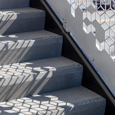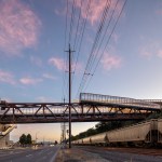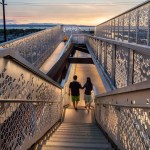 But the design’s real allure lies in what its users can see as they stroll the length of span. Doing triple duty as a safety rail, a brise soleil, and a decorative add-on, a series of aluminum panels decorate the sides of the walkways and turn the bridge into an eye-catching piece of infrastructure. As LMN’s Scott Crawford, Assoc. AIA, recalls: “We started looking at aluminum plate—a material that could be left bare but that you could also put some kind of pattern on.” Local contractors used a digitally guided CNC waterjet to slice rhomboid forms into the aluminum, with no two panels alike. By day, the pattern casts hypnotic shadows on the deck; by night, the effect is even more dramatic, with concealed LED lighting setting the whole bridge aglow with a spectacular, strangely tactile shimmer.
