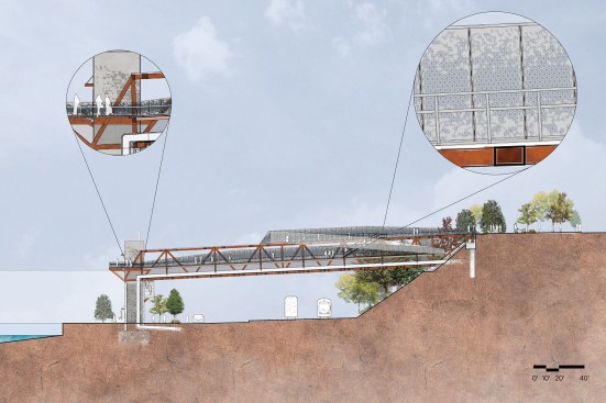 Contextually, the truss was a perfect fit: The open structure of braces and struts is an obvious nod to the classic railroad bridges of America. Sturdy and economical, the simple frame also gave the designers some flexibility in the arrangement of the walkway, which scissors downward from the park in two stages to guide pedestrians gently westward from the ridge top, before carrying them over the main span towards a staircase and elevator in the concrete volume on the coastal side. Hidden beneath the deck, drainage pipes and other technical systems are out of sight to all but passing motorists and conductors.