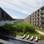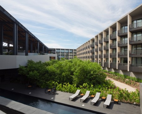 The second block is located at the center of the site, forming a visual and spatial connection between the various elements. It takes a rectangular shape, surrounded by a four-story block of hotel rooms. Inside are the fabulous mangrove gardens, which are preserved and used to create a central garden, the perfect setting for the surrounding rooms.