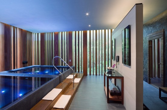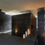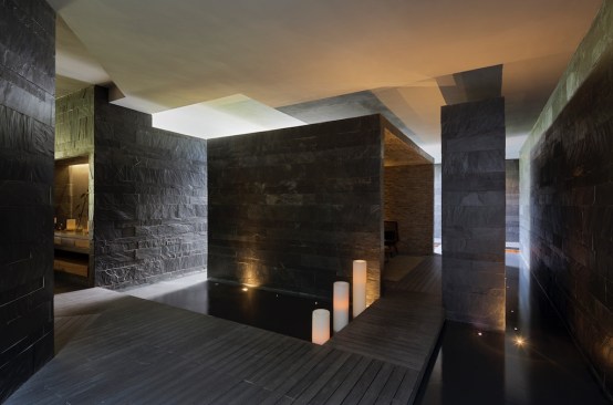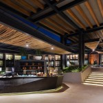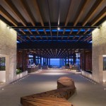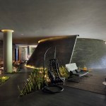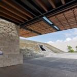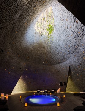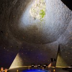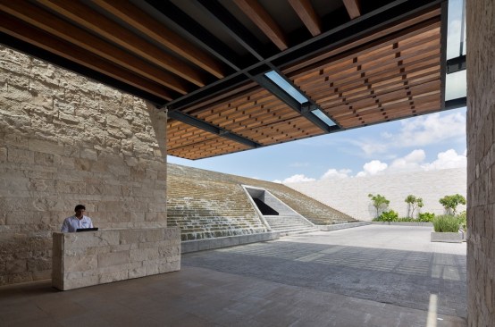 A large curved, conical, stone-clad volume rising from the earth is the pricipal visual element related to the spa. Its design alludes to the magnificent cenote pools that are unique to this area. Inside an expansive, peaceful space is provided for guests to relax. Beyond the cenote’s top, guests descend a ramp and arrive at a large area that features kiosk that serve different kinds of refreshments one might find in a traditional Mexican market, such as agua fresca.