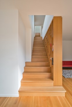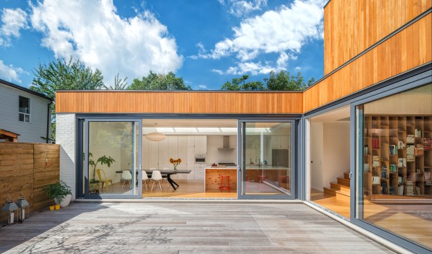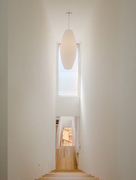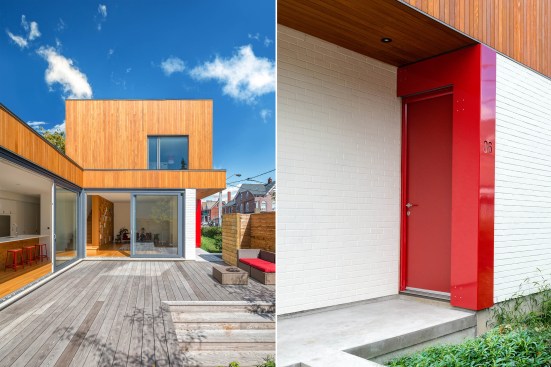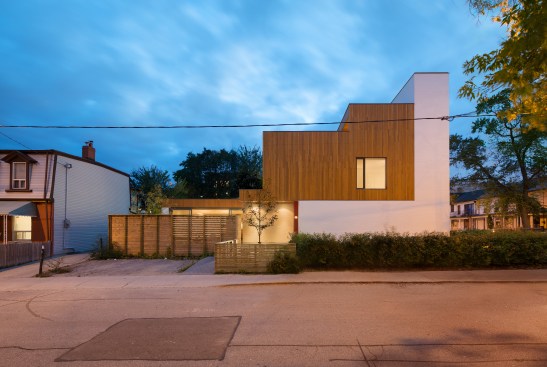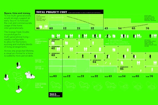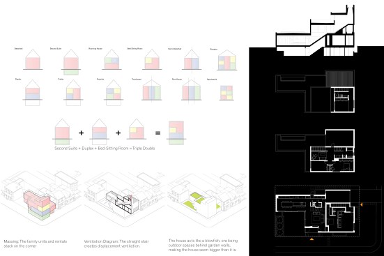 A corner lot in Toronto's Chinatown is the site for a multi-unit and multi-generational housing prototype. Stacking rental units and a grandparent’s suite below a single family home recognizes the possibilities of intensification latent in the morphology of Toronto’s urban fabric. The house allows for autonomy while mutually benefiting from proximity – the grandparents care for their grandchild and embrace the security of being looked after as they age. The young couple gains a single family home in a city that is becoming unaffordable to new families. A rental unit allows the family to maximize built form in a city that has ever increasing land values and construction costs. (refer to proforma – space, time and money) Research into the allowable unit types previously approved by the City (refer to typology diagram) provides the raw material for the spatial organization of the project. A second suite, plus a duplex, plus a bed-sitting room gives us the right mix of unit types to make this project work, albeit in an unconventional form. Increasing density on the site while at the same time increasing the site’s occupiable green spaces was a critical development in this project. The extended family shares a ground floor courtyard where the cooking and living spaces spill out onto the deck, blending inside and out. Each family member also has a large private and protected terrace above grade. Future scenarios imagine the family using the units in a variety of ways: The children may move into a rental unit as they gain independence or the parents may occupy the ground floor apartment and rent out the main house to another family while the children are away at school. Discreet millwork components can be removed to connect the units and allow ageing grandparents to live on the ground floor in an accessible apartment that is connected to the shared family spaces. The massing of the house resists the overt spatial diagram of this multi-generational scenario and intentionally conflates the units into a single gesture that holds the urban corner. Rising towards Grange Street, the stepped section reaches the maximum height of 12m permitted by city zoning ordinances, and culminates in a double-height space topped by an operable skylight that promotes natural ventilation from the large courtyard windows via the linear, double-run stair. A section through the stair exposes the unexpected window to volume relationship that occurs as a product of the democratic façade that gives each unit the same amount of glass. An increased level of insulation at the brick facade acts as a heavy winter coat and keeps the north side of the house well protected. The brick facade is composed of batches of ‘left-over’ bricks that would have otherwise been waste construction material. White paint unifies the varied brick into a single form and ties the house into the neighbourhood where painted brick is the norm. The heating system was designed to provide individual unit control and allows the different sections of the house to be dialed down when not in use to reduce energy consumption. The low 18.4% of glazing ensures that when heating or cooling is required, that energy stays within the envelope and is not lost to expanses of glass. The Grange Triple Double creates a unique form for owner-driven multi-unit housing development in Toronto that would not have been possible without the profound engagement of the client and the opportunities discovered in the city’s by-laws. It is a proof -of-concept that increased density can feel expansive and not preclude large, vibrant outdoor spaces. It confirms that modern details can be contextualized though materials and finishes to create housing that embraces new ways of living in old neighbourhoods. As the family changes so can the family home. Project initiated under Williamson Chong Architects.