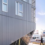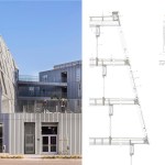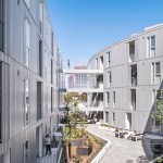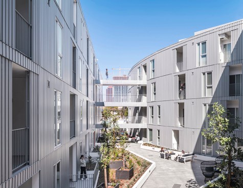 Corrugated metal panels clad the five-story structures, while asymmetric triangular cuts in the volumes intensify different parts of each building by widening the sidewalk, visually connecting the second-floor podium to the street, and allowing more daylight to reach the pool. The composition creates an urban village of eccentric public spaces, transforming what could have been three simple blocks of housing into a compelling place of spatial interest.