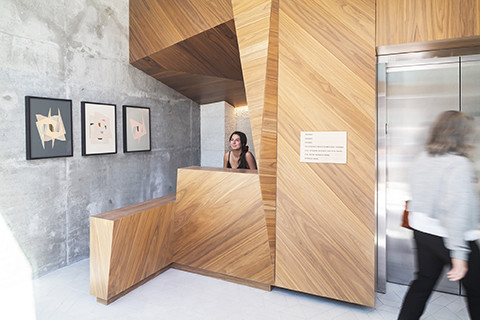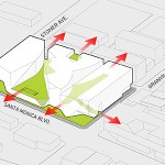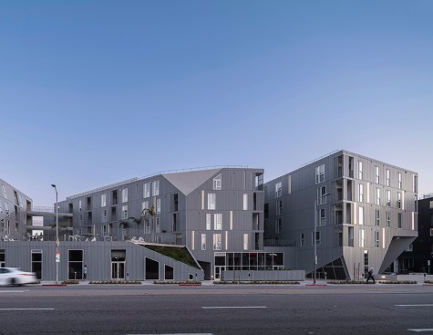 Designed by locally based Lorcan O’Herlihy Architects, Granville 1500 comprises three faceted and distinctive blocks that open to Los Angeles’ Santa Monica Boulevard. The 153-unit, 320,000-square-foot student housing project replaces a car dealership, exemplifying how mixed-use infill can help move a city from car-centric sprawl toward a denser, pedestrian-friendly experience. Ground-level retail engages the street while a raised podium conceals parking and creates a protected open space with a swimming pool for residents one story above the sidewalk.