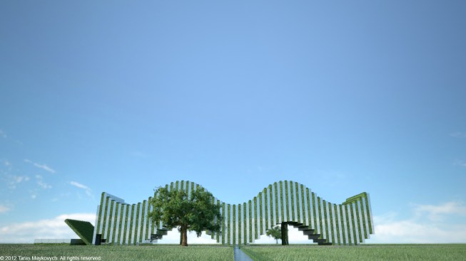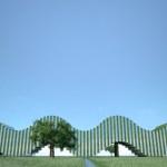 A blend between a grass field and the skies, green and blue, nature and architecture, simple harmony.