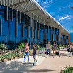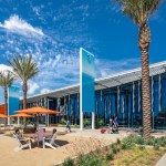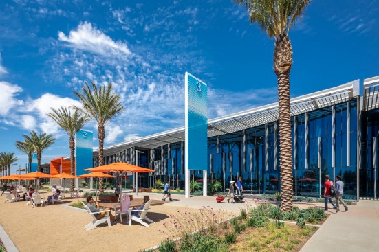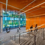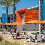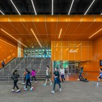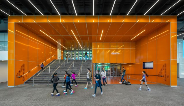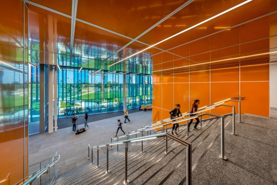 Entering the campus, they are greeted by a palm tree-lined pedestrian walkway and a 3,500-square-foot beach and boardwalk made of IPE wood, inspired by Southern California’s culture. The building’s façade features a ripple of silver fins mimicking the surface of the ocean, with pops of orange to represent the Ducks. In the curving hallways leading to the ice, the blue glass façade immerses guests in blue light, similar to the experience of a winding river.