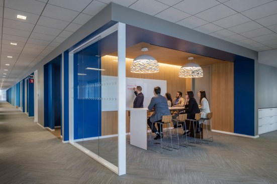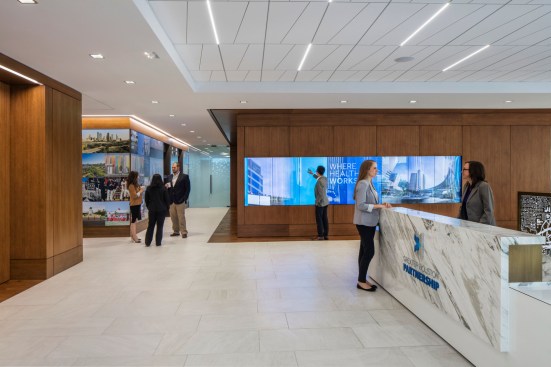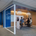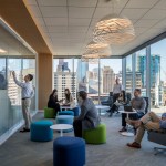 Every feature of the project is a tribute to Houston. A 27-foot interactive video wall featuring Houston and the many initiatives and activities of The Partnership greets visitors as they enter the space. In addition, a 92-foot magnetic interchangeable photo mural (dubbed Houston’s first “Instagram Wall”) takes you from the elevator lobby down the hall that serves as a pre-function space for a state of the art conference center. The entire public space can be converted from work, to banquet, to party space by moving what are typically fixed elements in the reception area as well as a variety of different furniture arrangements in the conference space. Other “Houston” features include 3 internally lit bronze “lanterns” that feature 6 maps of Houston’s iconic bayous. Finishes and textures evoke Houston themes such as the geometric and geologic shapes in the ceiling, carpet, and wallcoverings that are a nod to our science and technology markets. Pecan is used throughout, a native tree to Houston, and warm metals and leather evoke our industrial and Texas roots. Special lighting is installed just outside of the VIP meeting area and lounge to accommodate photos with visiting and local dignitaries. The back of house office space promotes the ideal amount of collaboration both within the open work plan, various open collaboration areas, conference rooms, and private offices. All of the private offices are “inboard” next to the building core, allowing the open work environment to be along the glass with maximum daylight and views to the most people.