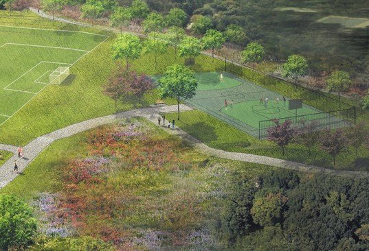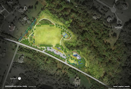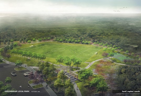 In addition, Hord Coplan Macht led the design team and MNCPPC through the sustainable sites initiative evaluation process. Intensive storm water management, use of sustainable design practices, native plantings, local materials and state of the art children’s play area are key features of the park design. The design of the park structures is a collaboration between the Hord Coplan Macht Architects and Landscape Architects. The park just began construction.