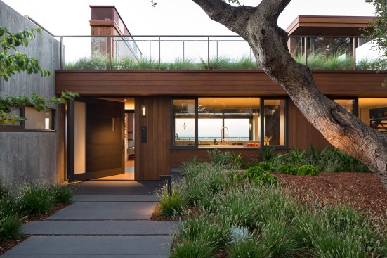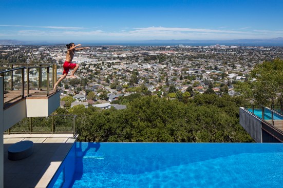 One Greenfield Court is a new home sited on the edge of a wooded bluff in a quiet neighborhood of the San Mateo hills. The site provides sweeping vistas of the San Francisco Bay, including a view of San Francisco to the north and the East Bay hills as they range south. Early program discussions established a mandate for site sensitivity and topographic integration, with a desire for the home to organically grow out of the terrain while being rooted in the descending hillside. As a result, the home appears diminutive and secluded from the street as it is blanketed by a rolling green roof that berms over most of the upper level. Hints of the views beyond can be glimpsed through the center of the home and around the green edges, but the magnitude of the visual drama beyond is mostly hidden from curbside. Passing through an entry court that is framed with inclining concrete arms, the downhill side of the home is revealed as a series of terraces that arc with the natural contours of the slope while providing light and outdoor access to the seemingly submerged rooms within. These curving exterior spaces are bound together by a number of steps and stairs that serve to link all outdoor areas, from a rooftop view terrace to a swimming pool that is semi-recessed into the hillside near the south property line.