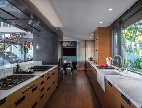 And while the home is outwardly ‘green’ thanks to the turf roof, the residence was also designed to be environmentally sensitive in a number of other ways. One Greenfield Court uses ground sourced heat pumps supported by eight 200’ deep wells to condition both the house and the pool. High levels of internal thermal mass help moderate exterior temperature extremes and semi-passive cooling strategies include a whole-house ventilation system to exhaust hot air from the interior via the ‘air stair’ core. Wood exterior siding systems incorporate rain screen technology and an array of PV cells is installed on the stair tower roof to offset electricity use during the daytime. And in anticipation of a dryer climate, the house incorporates a rainwater retention system with a dual underground cistern capacity of over 15,000 gallons. In recognition of these and other strategies, One Greenfield Court was certified as LEED Gold for homes upon completion in 2017.