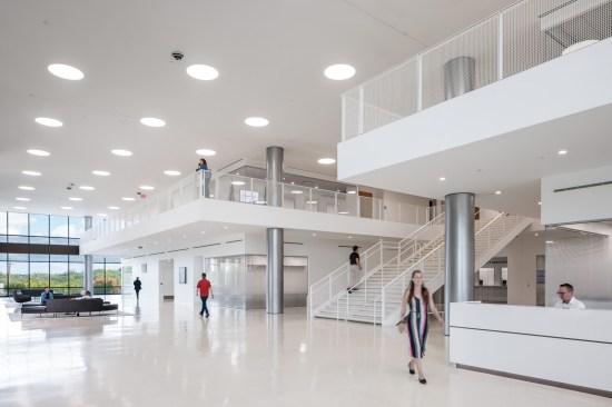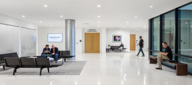The new Administration Buildings consist of two contemporary, fully-amenitized five and six-floor office towers connected by a pedestrian skybridge. Consolidating the full array of the County’s public services in one central location, the buildings consist of twin lobby levels housing Tax, Real Property Services, the Council Chamber, as well as future retail and fast-casual food options. The terrace level, housing the Probate and Magistrate Courts as well as supporting offices, features dramatic outdoor people space with places to sit and linger sheltered by the iconic canopy overhead. Upper floors include County offices, employee training and wellness zones as well as a variety of conference rooms and huddle spaces.
