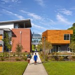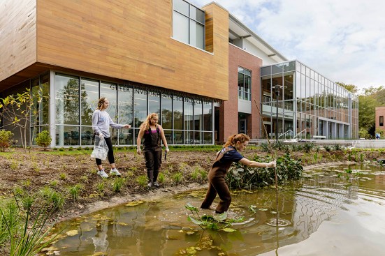Organized thematically around the earth’s four spheres – atmosphere, hydrosphere, lithosphere, and biosphere – the Greer Environmental Sciences Center features sophisticated indoor and outdoor learning spaces that embody “science on display” and promote hands-on experiences, interactive learning, and interdisciplinary research. The facility features a geothermal system for heating, cooling, and domestic hot water, an array of photovoltaic (PV) panels, and a small-scale demonstration wind turbine. An extensive green roof, vegetated bioretention basins, and constructed wetlands serve innovative project-based curriculum while also treating stormwater runoff on-site.