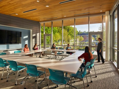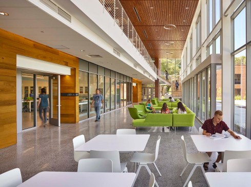 This LEED Gold building features a 50-person tiered lecture room, two 36-person active learning classrooms, two 20-person seminar rooms, ten teaching labs, many shared learning spaces, and a Geographic Information System (GIS) classroom. Formal and informal group study spaces are located throughout the building. These classrooms and common spaces are accessible to non-science majors and provide opportunities for all students to develop a closer connection to the sciences.