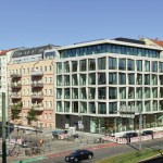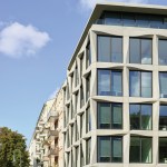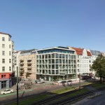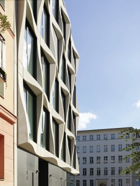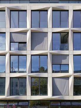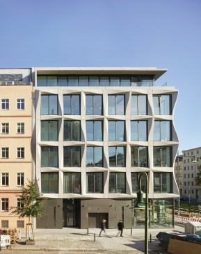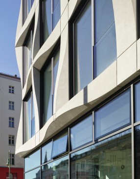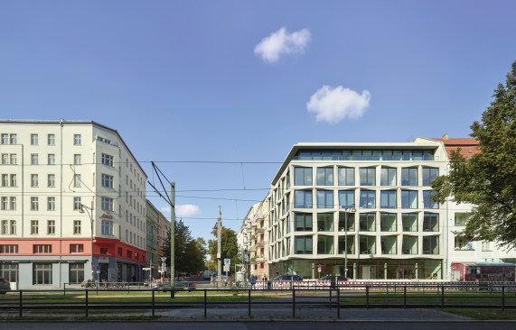 On the 464 m² corner site between Greifswalder Str. and Heinrich-Roller-Str. in the Berlin district of Pankow, Prenzlauer Berg, an office building was created whose expressive, lively main façade with its floor-to-ceiling, square grid structure of light architectural concrete prefabricated parts immediately strikes the eye.