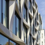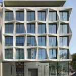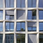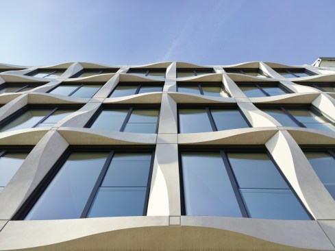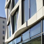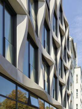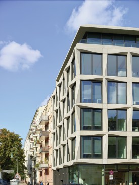The street façade on the ground floor consists of large-format insulating glazing in mullion-transom construction. From the first to the fourth upper floor, the façade is constructed in a square grid of architectural concrete. The slightly twisted pillars and floor slab strips meet alternately at either a high or low point and form a coherent, dynamic, organic-flowing structure. At the high points of the grid structure, the façade protrudes 50cm above the building line. The inner courtyard facades were realized as plaster façades with circumferential window bands with metal railings. The roof area with its restrained glass façade forms the clear, calm end of the building.