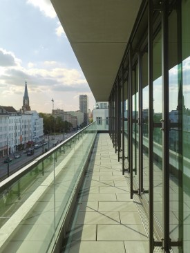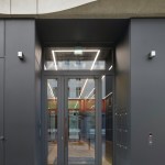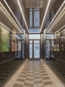 The representative foyer of the main entrance is accessed from Heinrich-Roller-Straße. As a special design element, the lighting is integrated into the ceiling, backlit showcases in the walls are intended for the exhibition of works of art.