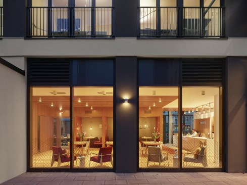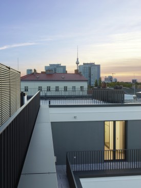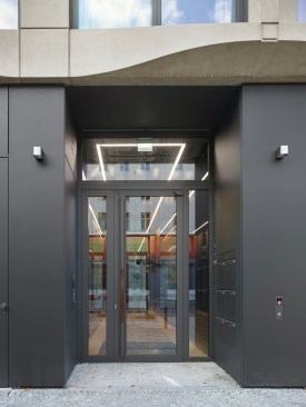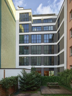 The new building, which is used as a modern office business centre, follows the line of the building on the street side and connects to the fire walls of the neighbouring buildings while maintaining the spacing in the courtyard and exploiting the maximum building depth. All new building parts have flat roofs.