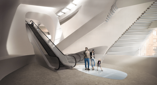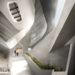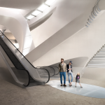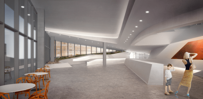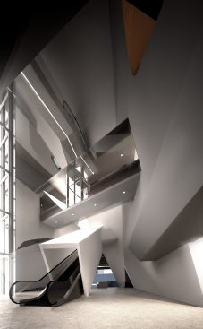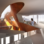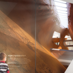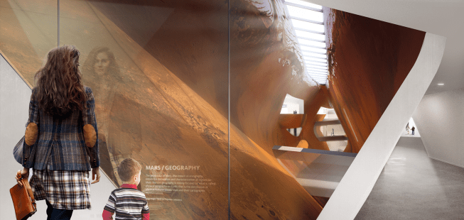 From the urban lobby you move upward through a sequence of spaces whose formation exhilarates and engages ones mind to wonder about what might be next. This sequence starts on an escalator at street level, ascending to a landing suspended within the main entry volume. You cross a glass floor where you see the main stair below. You now get a commanding view of the park to the South-East, making a visual link to the broader campus strategy. From here you take the second escalator, moving vertically through a thickened wall that connects the park to the roof through a fluid formal language. Before crossing this threshold, the wall reveals a skylight above that turns down to the left revealing an exhibit space, increasing the anticipation of what is to come. Once through the wall, the space expands in all directions producing a sense of vastness for children and adults. This sensation is re-enforced by the scale of the “cross-void” exhibit, depicting the Martian surface, reminding us that we occupy a small corner of the known universe. On the fourth floor you see Downtown Louisville through the windows beyond and have free public access to the roof terrace, the café, and the views of park and city before you ever have to purchase a ticket or enter the museum. After purchasing a ticket, you move through your first door into a small gallery before gradually descending via gentle ramps through the rest of the museum. The internal circulation is organized to maximize spatial variation by moving along, through, and across the major spaces connecting internal exhibits to the semi-external exhibit/public spaces. This continuous engagement with the atrium provides way finding for the building while also revealing the conditions that were curiosities before.