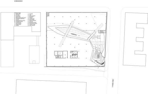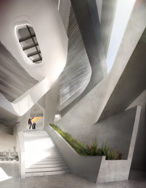 The design leverages the internal and external environment revealing the urban context as an extension of the museums and its function. The plants and water feature of the park become exhibits of nature, while also passively cooling the site. This cool air is drawn through the under street entrance up through the atrium to windows along the west wall of the “cross-void” to evacuate the rising warm air. In colder months, the design collects warmer air in the upper atrium, producing a tempered zone where ticketing and entry occur. A large solar array on the south façade / roof is visible from the park, ticket counter skylight, and from the roof deck. Passive and active strategies, sustainable plantings, and integrated solar increase the overall sustainability and produce a museum that is itself a didactic exhibit.