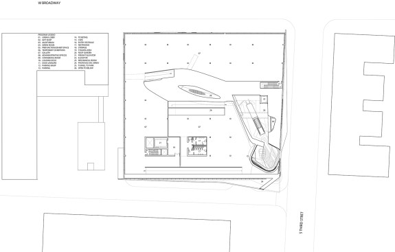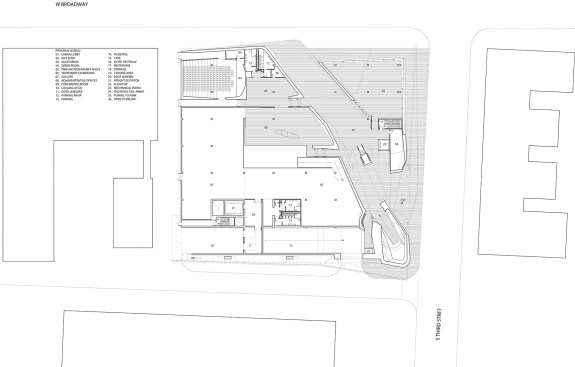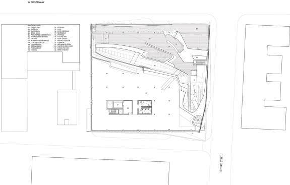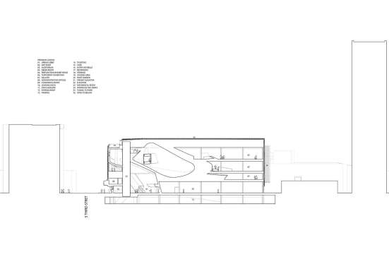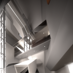 The street level program is organized so that the museum store, auditorium, and temporary exhibition gallery can be securely closed off from the rest of the museum outside typical hours of operation. The ability to segregate these spaces allows for special fundraising events or parties to take place in the unique urban lobby, atrium and roof deck now serving as pre-function or curated event spaces directly engaging the life of the city. From the temporary gallery you also get a view upward into the “cross-void” via a window at its base, further emphasizing the ideas of threshold, curiosity, anticipation and discovery.