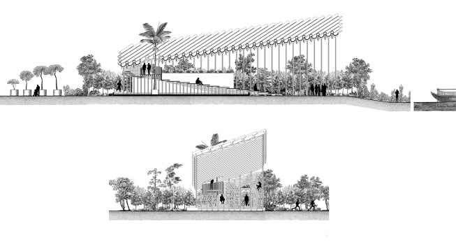 Just as the process of growing trees requires good soil, so the process of growing culture requires a strong foundation of collective memories of the city. Growing Up captures everyday elements fundamental to Hong Kong, embedding and cultivating them within the fabric of a soon-to-be major arts and cultural center. A large sloped roof is supported by a series of timber columns that, like the seedlings in the adjacent nursery park, grow from an intimate human scale to the harbor scale. A stepped landscape below, reminiscent of the city’s hilly topography, provides both seating and stage for different activities. Despite its simple volume, each angle of the pavilion reveals a different sense of porosity, materiality, and scale. The north and south elevations are characterized by transparency, the surrounding trees a seamless backdrop between the pavilion’s slender columns. However, as one moves around and the columns overlap in perspective, the pavilion edge becomes more solid and frames the waterfront view. The pavilion appears the most dense from the east, the structure of the steps forming an intricate screen to accentuate the transition from park to waterfront. In contrast, an open gathering space and distinct profile emerges from the harbor. The pavilion's multifaceted character truly reflects the rich diversity of Hong Kong.