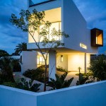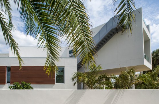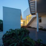 The two wings are connected by a courtyard and a two story exposed concrete wall along the main stairs. The elevated wing spans over the small yard creating a shaded space between the courtyard and the beach access. The path down to the beach access from the main living spaces adds to the perceived dimensions of an otherwise small site by taking advantage of the diagonal of the yard. To reach the beach access, the resident would exit the house from the opposite corner, cross the courtyard, walk under the raised living, before reaching the gate leading to the beach.