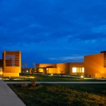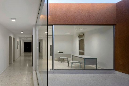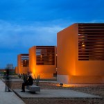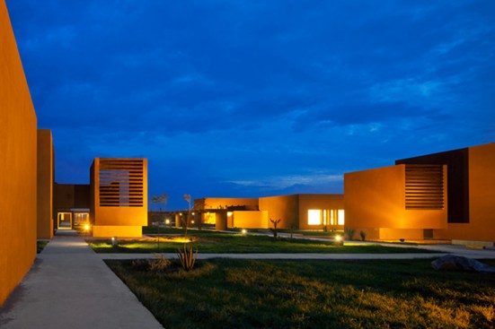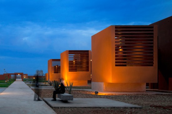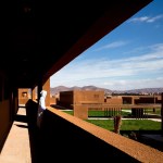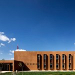 Situated in Guelmin, 200 kilometres south of Agadir and known as the “door of the Sahara”, the School was conceived in line with a policy of decentralisation and making education more accessible to those living in remote areas. Comprising a 250-seat lecture hall, classrooms, laboratories, study rooms, library, offices, sports grounds and staff accommodation, the campus is connected by a series of canopies that create sheltered walkways and seating areas along the north/south axis dividing the campus into two. This organisation makes for readability and clarity of the various elements of the project, while preserving the diversity of the programme. Principally rough-rendered reinforced concrete, buildings are linked by courtyards and partially covered walkways with metal and timber elements. Their volume is massive, yet this scaling finds balance with the projecting windows, louvers and narrow openings repeated throughout. Thermal considerations informed the design, including the orientation, window shading and natural ventilation. Low, massive and with varying volumes, the architecture is boldly contemporary but inspired by its context. Exterior walls are painted ochre, blending with the landscape and the town. In dramatic contrast, interiors are painted in immaculate white. Local stone was used for the terrazzo flooring. The landscaping minimises water use through a choice of local plants and natural ornamental rockeries.