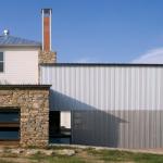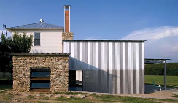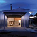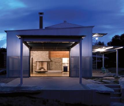 Hoping to avoid lots of glass because at night “those walls become mirrors,” Shipley sandwiched together two corrugated materials—clear plastic and perforated aluminum—to create a scrim that lets light flow through during the day and turns into a solid wall at sunset. Inside, long-leaf pine boards and local fieldstone contribute a rustic edge to the graceful space. “You have these ordinary parts,” Shipley says, “and you try to put them together in a way that’s sophisticated but not too obviously designed.”