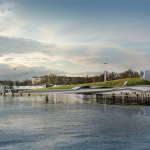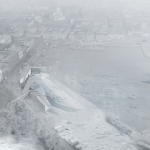 When looking south, back from Market Square, the building presents itself as a clean, modern addition to the historic urban fabric while only hinting at what lies beyond. Along the western edge of the new museum, the building forms an edge between the city/port and the park/port, where the Laivasillankatu and the port access road are spatially redefined as a channel leading to a threshold at Eteläinen Makasiinikatu. This threshold heightens vehicular and pedestrian arrival to the northern port district via spatial compression and release. From the port terminal and further south, the museum raises the ground plane to link the museum roof with Tähtitornin vuori park, conceptually extending the park to the waters edge. At a regional scale the project connects the museum to Helsinki’s “green fingers” blending this new enlarged park as part of this extended archipelago. At a national scale the project evokes the Finnish ethos, manifesting the nations emotional connection to the natural landscape that is bathed in a sublime light.
