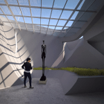 Visitors arrive at the main entrance from the vehicular drop-off at the museums northernmost edge. From this location you enter by traveling up a gentle slope visually connected to the Museum Gift Shop and to the Café along the water’s edge, heightening your ascension through the section of the landscape. The gift shop and cafe can be accessed from the ground floor connecting the base of the building to the pedestrian experience of the new district. This procession from the ground up to the new-elevated landscape situates one within the heart of the building. Another entrance connects Tähtitornin vuori park from the west via a bridge across Laivasillankatu to an elevated sculpture plaza conceptually extending the new art landscape into the existing park. This plaza can also be reached via a grand stair from the new pedestrian/bike path along Laivasillankatu. The plaza provides opportunity for sculptures to be viewed prior to ticketing and provides new outdoor opportunities for events within the site. The final entrance faces east and connects the port terminal along a new boardwalk where you would have the option to gently walk up to the upper level or to continue on the quay to the north passing the café and several galleries along the way. All three entrances lead you to the main atrium, which serves as a wayfinding device within the site and where the multi-layered concept of the building is first revealed.