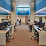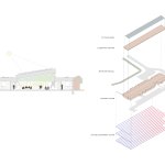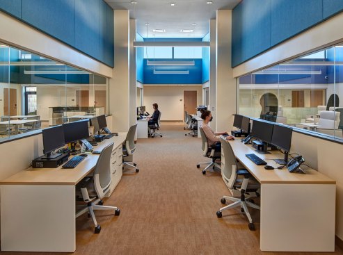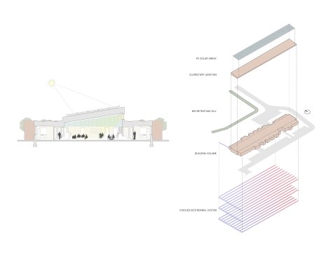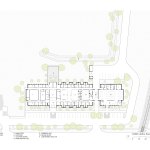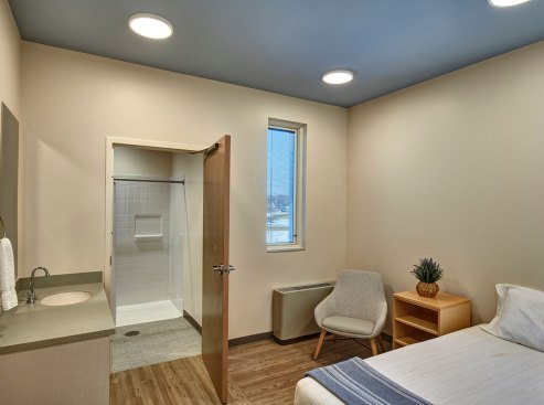 The building is organized around its three program elements – office, behavioral services, and shelter – and is punctured across its main facade with primary access points. Inviting entrances incorporate full glazing to create welcoming and safe access. The symmetrical and repetitive plan emphasizes spatial simplicity. Uninterrupted clerestories run the width of the building delivering calming filtered daylight. The roof accommodates a 390-panel photovoltaic array which works in concert with a highly efficient VRF heating/cooling system that is connected to a stacked geothermal well field.
