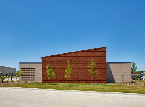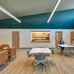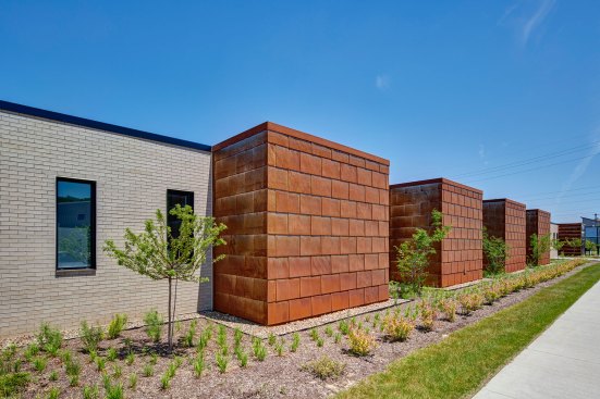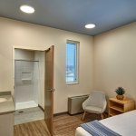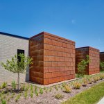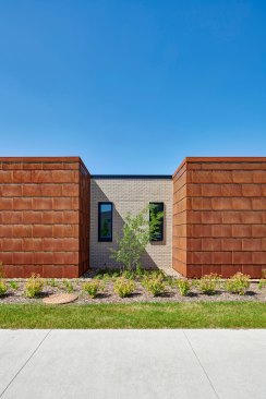 Brick and weathering steel deliver durability to the exterior. The weathering steel lends symbolism to the building’s purpose with temporal and self-healing properties. This material clads private restrooms, which are pulled from the main spine of the building to create a passive separation between the public walks and the windows of the guest rooms. Outside, a screened courtyard and patio provide protected outdoor respite with visual privacy. A cool, natural color palette infuses the interior with a calm atmosphere that minimizes environmental stressors. Durable materials and behavioral health furnishings endure high impact while responding to the specific needs of trauma-informed design.