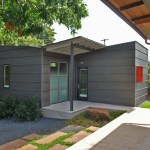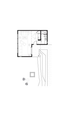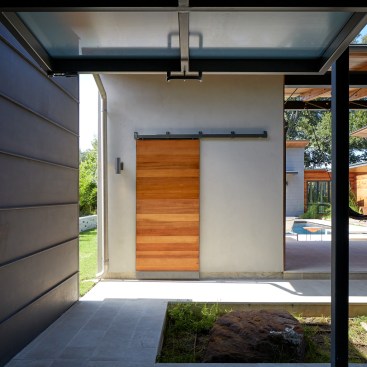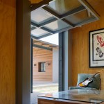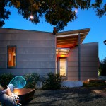 The Guitar studio consist of 390 sq. ft. Designed to accommodate a multitude of uses including guitar playing, entertaining,reading, passing the night and a place for thoughtful repose. The existing home, required setbacks and large adjacent Pecan tree contained the location of the court that would be selected for the site. The studio offers ease of connectivity to the main house while offering the inhabitants a subtle privacy from the local environment. The studio was clad in a single material, standard standing seam metal roof panels form the V shaped roof while also cladding the exterior walls. The interior offers a rich experience of painted wall surfaces and natural pine plywood to assist in the warmth and acoustic qualities of the space. A small kitchen bar, closet and bathroom make the space versatile for a variety of uses. The counterweighted overhead glass door offers a large opening and ease of connectivity between the studio and the adjacent fire pit courtyard.