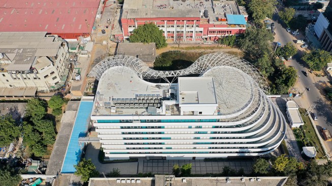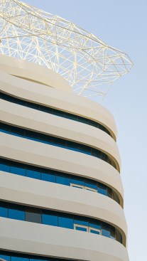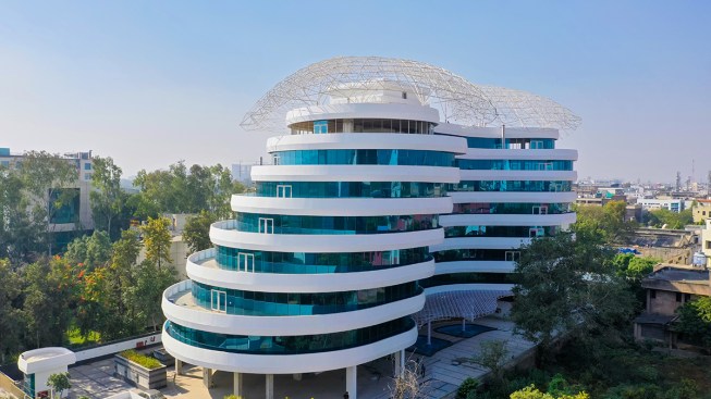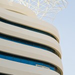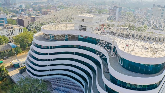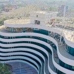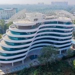 An orientation-sensitive design is enabled by stepping the built-form as it recedes South to North, enabling the North-Glazed façade with scatter free light and ensuring that all internal courts get sufficient sunlight. It also allows for terraces to be formed on the Southern Side, full of sunlight and ventilation, a welcome break from enclosed office spaces. To enable wind flow and ensuring that all units get sufficient ventilation, the North and south are retained as open to allowing for the movement of summer and winter winds. In the absence of any formal site influences, a fluid, rhythmic, yet continuous form is inspired by nature to create an iconic identity in the otherwise mundane surroundings achieved by the creation of gradually, steeping up terraces. A Roof line is developed that follows the floor profile to complement the overall form of the built volume resulting in a structure that bears a resemblance to the sand dunes in the deserts of the Middle East with the distinct floors characterized by the ripples on a sand dune. Adopting the innovative technology of a space frame with glass, polycarbonate panels to create a semi-covered roofing system at the top, to which the building tapers to and enables the aerial view to be viewed as a vague ‘8’. The parapets are further softened by the optimization of greenery and planters along the railing. Embedded lighting design further accentuates the curvilinear form of the building.