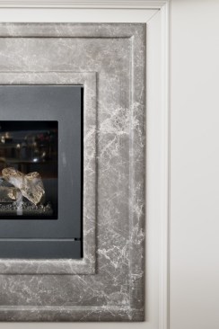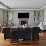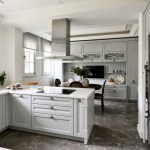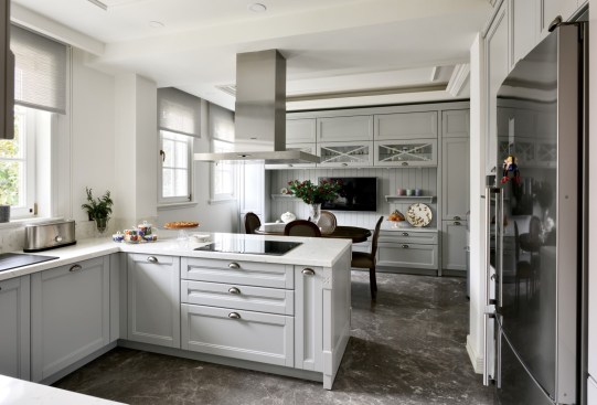 Natural material marble was preferred for the kitchen structure and entrance floors, which were added to the project later. The half island kitchen, which is preferred in kitchen design, provides separation between the breakfast table and the service preparation area. A warm and friendly ‘starting to the day’ environment has been created with the dark wooden table, the television and the wooden showcase that keeps the kitchen utensils located in all the grayness. The patterns on the kitchen cabinet doors and the brass details on the handles give this cute kitchen a ‘special for the user’ look.